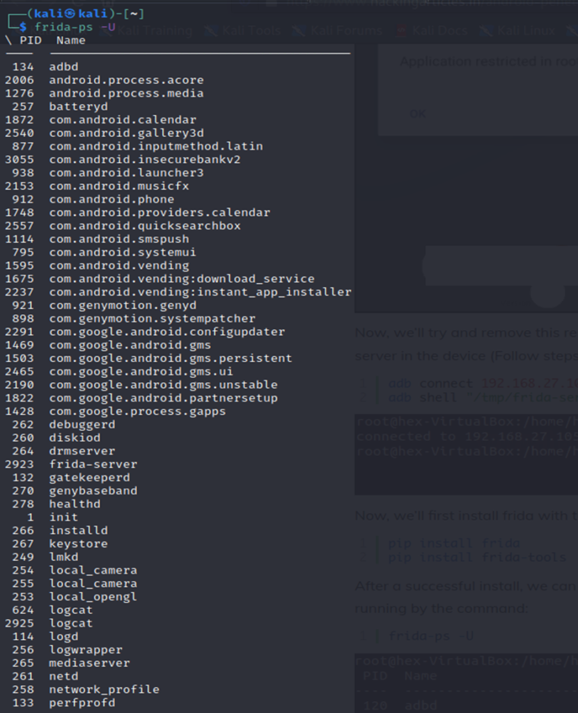 3. After pushing the frida-server, now we need to run the server in order to intercept the running services in the android device