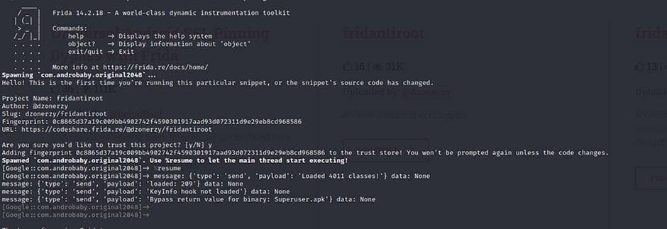 6. type %resume and wait to restart the application. If the root detection alert is gone after restart then you successfully bypass the root detection.
