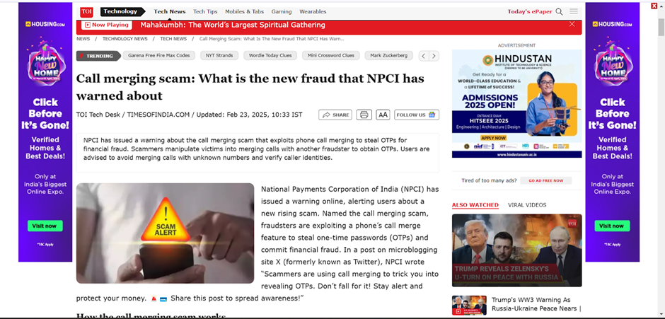 there is a lack of detailed, documented cases from reputable news sources that focus exclusively on call merging scams. While the National Payments Corporation of India (NPCI) and various media outlets have issued warnings about the emergence of such scams, they often discuss the modus operandi and preventive measures rather than providing detailed accounts of specific incidents.