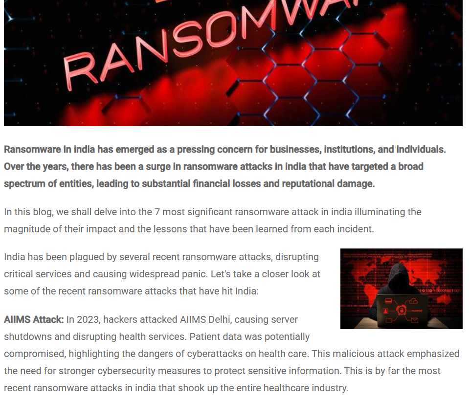 In November 2023, the All India Institute of Medical Sciences (AIIMS) in New Delhi, one of India’s premier medical institutions, suffered a significant ransomware attack. This cyber assault led to the shutdown of servers and disrupted healthcare services, raising concerns about the security of sensitive patient data and the vulnerability of critical infrastructure.